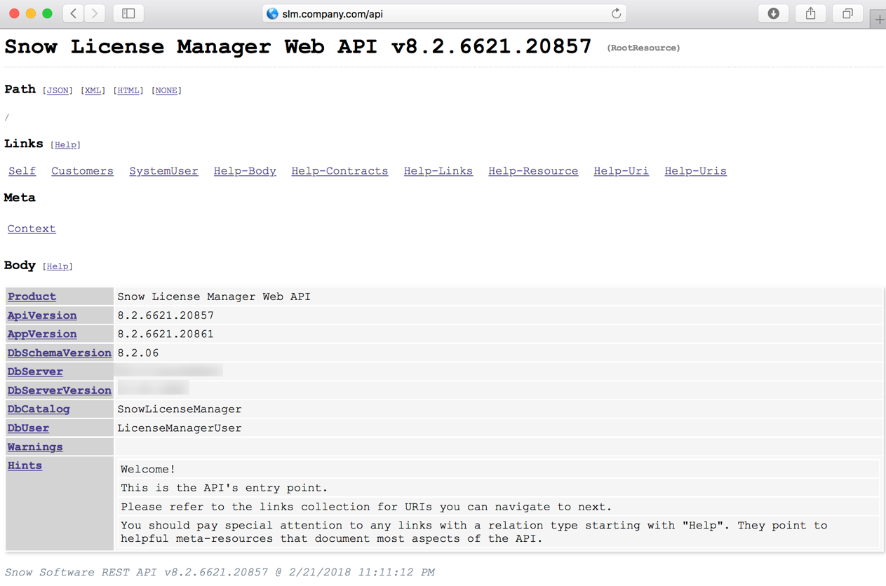 Access the Snow License Manager Web API, and verify that you can log in to it. The API is accessible by adding /api to your SLM URL.